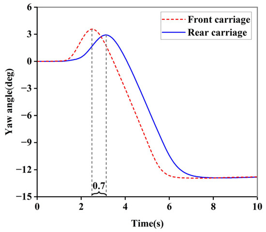 After the steering wheel angle is entered by the driver, the first reaction is the front carriage. The front carriage produces the yaw angle and drives the rear carriage to turn. The sequence is fixed; the yaw angle of the front carriage is larger than that of the rear carriage, and the change in the yaw angle at the end of the turn also follows the above law.