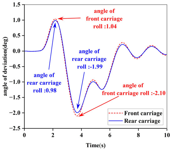 Figure 9 shows the cornering angle curve of the vehicle. Since the steering of the vehicle in the driving process will cause the centroid deflection, the sideslip angle is reflected on the car body. The appearance of the sideslip angle of the front carriage is earlier than that of the rear carriage. In addition, the sideslip angle of the front carriage at the wave peak is larger. At 4.5 s, the sideslip angle of the rear carriage is larger than that of the front carriage. The roll angle requires that the roll angle of the car body be less than 3°, since the roll angle is related to the lateral acceleration when the bus drives at a constant circle speed with a centripetal acceleration of 0.4 g. Generally speaking, the roll angle of the car body is measured by the roll gradient. Usually, the lateral angle of the vehicle is kept within 2.5°. In summary, the articulated bus mentioned in this report meets the requirements of the national standard.