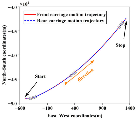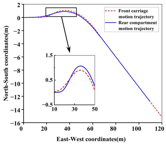 Figure 10 shows the driving path of the whole vehicle; the blue curve is the path of the front carriage, and the red dotted line represents the driving path of the rear carriage. The curves of the front and rear carriages are smooth when turning, and there is no tail flick phenomenon.