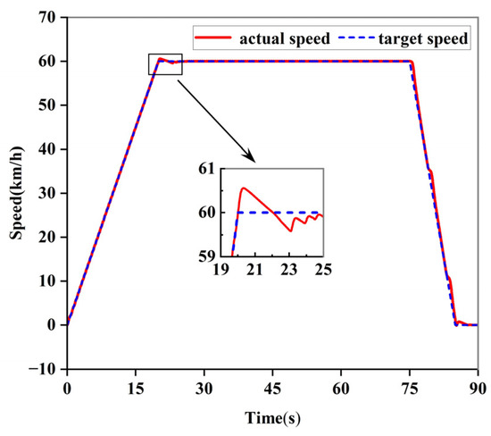 In Figure 11, the target speed curve basically coincides with the actual speed curve. There is a speed peak when the vehicle is accelerated to the highest speed, and then the speed converges to 60 km/h. The speed cannot reach a normal level in driving conditions, and the reason is related to the simulation path. When the bus runs on a circular road, the front carriage can be steered because the front wheels are steering wheels, but the steering of the rear carriage can only rely on the traction of the front carriage. Therefore, the driving force direction of the rear carriage should be on the tangent of the driving path during the driving process. There will be a small fluctuation in the speed of the whole vehicle, which is within 0.1 km/h and has little impact on the actual operation of the whole vehicle. The vehicle can reach the maximum speed in about 20 s on the ring road, and the power system of the whole vehicle is also verified. Its engine can meet the requirements of whole vehicle performance.