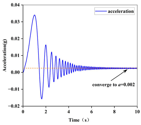 Figure 13 shows the sinusoidal oscillation curve, which is input by the steering wheel. At the beginning, the steering wheel is rotated 20° counterclockwise; then, it is rotated clockwise −15°, and then it is rotated +10° counterclockwise. It is worth noting that the peak value of the steering wheel angle input decreases sequentially. As a large counterclockwise rotation angle is produced at the initial stage of the test, the car body is not aligned by the subsequent steering; so, the vehicle path will deviate to the left. The acceleration curve is shown in Figure 14.
