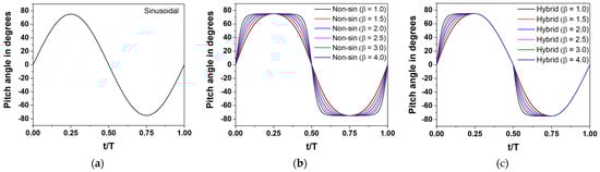 Figure 2b and Equation (2) show the characteristic behavior of the instantaneous pitching amplitude, θ(t), for non-sinusoidal motion that is engineered by integrating a specially designed trapezoidal-like pitching profile modulated by an adaptable parameter β, as described in [51]. Notably, when the modulation parameter β = 1.0, the resultant pitching motion closely approximates a sinusoidal profile with a phase lag of 90º behind the heaving movement. As the amplitude remains constant, deviations of β from 1.0 result in an extended duration, where θ(t) sustains the peak values of . This effect becomes increasingly pronounced as β ascends toward infinity (β ), with the profile tending toward a square wave.