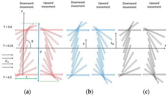 Figure 2a and Equation (1) show the profiles of the instantaneous pitching amplitude θ(t) for the sinusoidal motion [50], where the pitch angle increases and decreases in a regular pattern over time. The flat plate reaches its highest point on the graph at (t/T = 0.25), representing the maximum positive pitch angle () in the first half of the cycle. Subsequently, the flat plate reaches the horizontal position at (t/T = 0.5), while the lowest point represents the maximum negative pitch angle (−) at (t/T = 0.75) in the second half of the cycle.