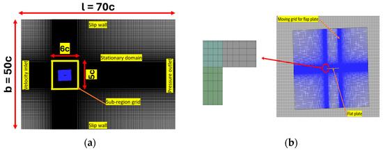 Figure 4 presents the rectangular computational region, meshing structure, subdivided mesh, and external constraints utilized for simulating this case study. An investigation into domain independence was conducted with the length, l, and the width, b, of the numerical domain. The range for l is from −20c to 50c, and for b, from −25c to 25c was chosen, as further increasing the simulation area had no influence on the results. The pressure for the exit point of the boundary was positioned at 50c, while the top and bottom boundaries were subjected to a slip boundary condition, as depicted in Figure 4a. The wing’s main body (highlighted by the rectangular region in blue) in Figure 4b was associated with moving grids and the detailed view of mesh near wing wall corners. The moving grid region took the form of a rectangular grid with a length of 6c and a width of 5c. The model utilized 2000 time steps for each oscillation period, with the outcomes being charted following the completion of seven cycles.