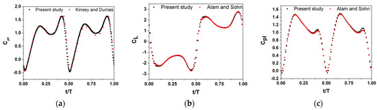 Comparison of the numerical results and the present study and the validation data: (a) pushing power coefficient for an oscillating plate at Re 1.1 × by Usoh et al. [50]; (b) pushing force coefficient at Re 500,000 by Alam and Sohn [20]; (c) pushing power coefficient at Re = 500,000 by Alam and Sohn [20].