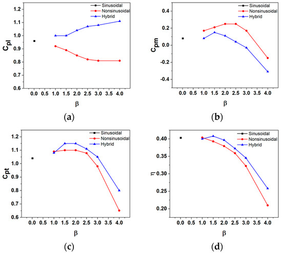 Comparison of sinusoidal, non-sinusoidal, and the proposed hybrid pitching motions versus various values of β (a) pushing power coefficient; (b) moment power coefficient; (c) output power coefficient; and (d) efficiency at = 0.14 and = 75°.