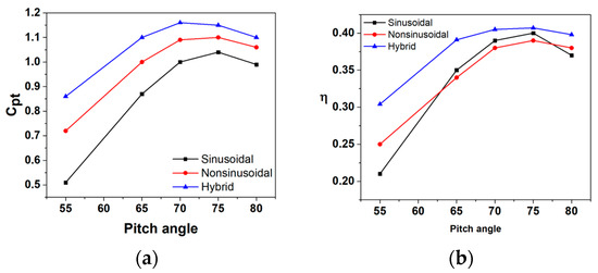 Figure 7b shows the efficiency for the sinusoidal, non-sinusoidal, and hybrid pitching motions across varying pitch angles from 55° to 80°. The hybrid motions, combining attributes of both sinusoidal and non-sinusoidal dynamics, consistently achieve higher efficiencies throughout the range, peaking at 75°. The graph clearly demonstrates that the hybrid motions are consistently outperforming the other two types.
