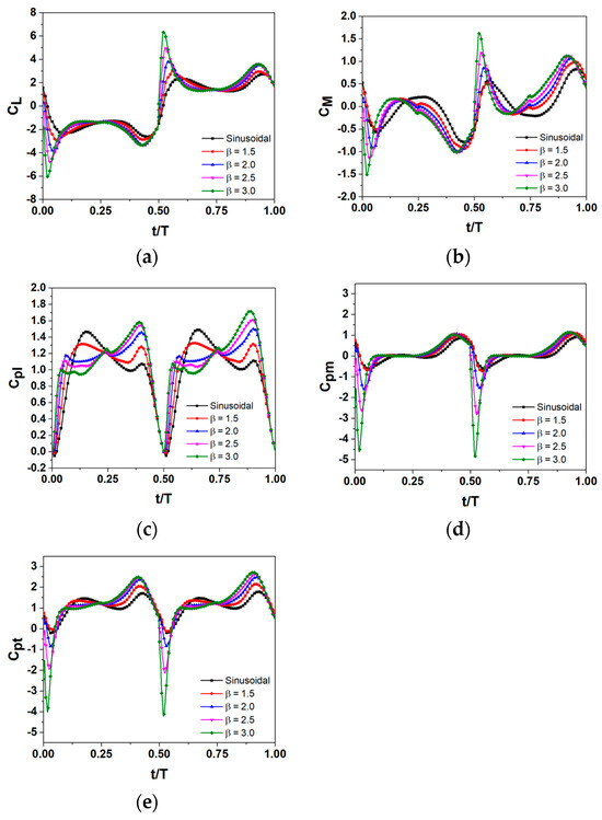 Figure 8 shows the calculated results of ,, , , and for the sinusoidal motion and the function of β for the hybrid pitching motions. Figure 8a shows an enhancement in the pushing force coefficient across the oscillation cycle. contributes positively to the pushing power coefficient for every case of the proposed hybrid pitching motion.