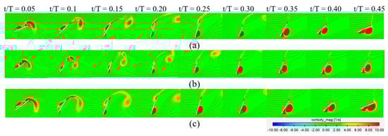Instantaneous vorticity and streamline plot within one period at different time steps for (a) sinusoidal; (b) non-sinusoidal (β = 1.5); and (c) hybrid (β = 1.5) with f* = 0.14 and θo = 75°.