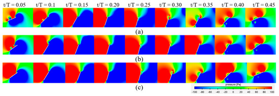 Pressure contour plot evolution over one period at different time steps for (a) sinusoidal; (b) non-sinusoidal; (β = 1.5); and (c) hybrid (β = 1.5) with f* = 0.14 and θo = 75°.