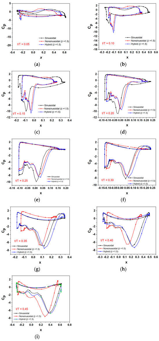 Pressure coefficient distribution on a flat plate along the x-direction over one period at different time steps: (a) t/T = 0.05; (b) t/T = 0.10; (c) t/T = 0.15; (d) t/T = 0.20; (e) t/T = 0.25; (f) t/T = 0.30; (g) t/T = 0.35; (h) t/T = 0.40; and (i) t/T = 0.45 for sinusoidal; non-sinusoidal (β = 1.5); and hybrid (β = 1.5) with f* = 0.14 and θo = 75°.