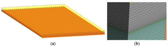 (a) Three-dimensional model of a 30-channel planar SOFC; (b) fragment of a grid with condensation for a 3D model of an SOFC cell. Сell operating parameters are presented in Table 1.