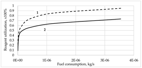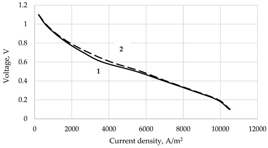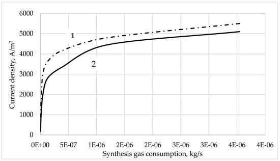 Thus, high gas velocity makes it possible to achieve high electrical power for SOFCs when operating on hydrogen but slightly reduces the electrical power of SOFCs when operating on hydrocarbon fuels. However, as fuel consumption increases, the current density increases. The increase in current density when operating on hydrogen is greater than for synthesis gas (Figure 13).
