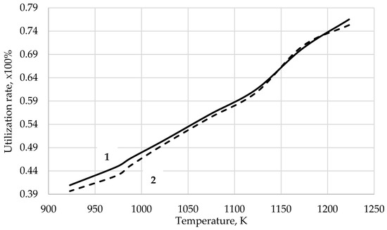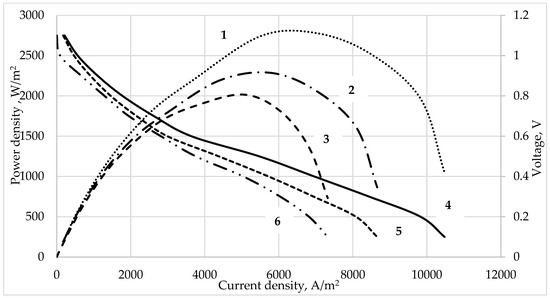 As the reagent utilization rate increases, the current density and specific power increase (Figure 14). For synthesis gas, the maximum power density is achieved with a utilization coefficient of hydrogen—0.43, methane—0.36, carbon monoxide—0.4, and oxygen—0.11.