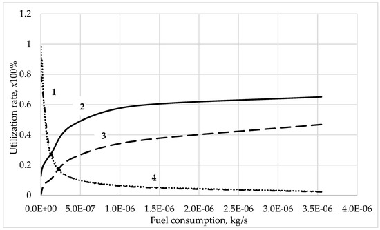 Dependence of changes in reagent utilization when operating on synthesis gas on the fuel supply rate. Hydrogen utilization rate—1, methane utilization rate—2, oxygen utilization rate—3, carbon monoxide utilization rate—4.