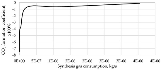 Dependence of changes in carbon dioxide formation when operating on synthesis gas on the fuel supply rate.