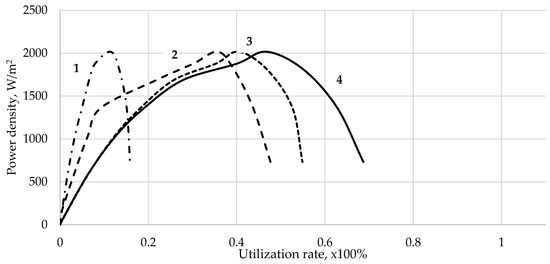 Dependence of the change in power density on the utilization of reagents in the synthesis gas supplied to the SOFC. Oxygen utilization rate—1, methane utilization rate—2, carbon monoxide utilization rate—3, hydrogen utilization rate—4.