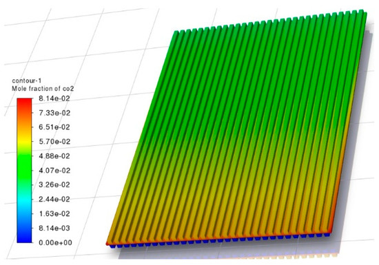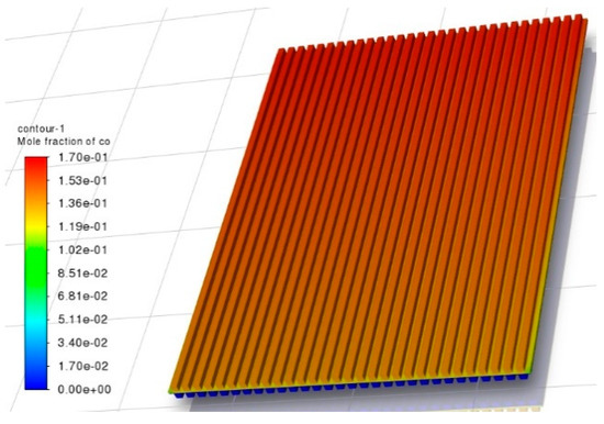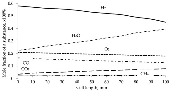 The distribution of reagents along the cell when synthesis gas is supplied at a voltage of 0.6 V is shown in Figure 15, Figure 16, Figure 17, Figure 18, Figure 19, Figure 20 and Figure 21.
