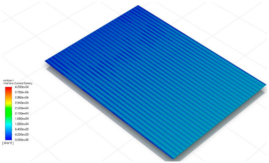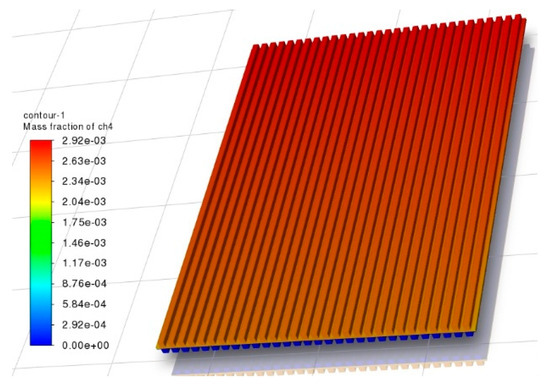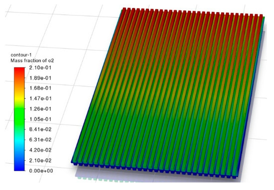 When synthesis gas is used as a fuel, steam reforming, carbon monoxide oxidation, and hydrogen–oxygen reactions occur simultaneously. The red color in Figure 16, Figure 17, Figure 18, Figure 19, Figure 20 and Figure 21 denotes a high content of the substance; by contrast, green denotes low content. Methane and oxygen (Figure 16 and Figure 17) are the main active reagents and enter the fuel cell, where they are consumed to produce hydrogen, CO, CO2, and water. Moreover, methane is not completely consumed and partially remains in the outlet gas mixture. Hydrogen is supplied to the fuel mixture in fairly large quantities and is also formed in the steam reforming reaction. Therefore, it is present in large quantities until the middle of the channel, and then it begins to be consumed in the electrochemical reaction (Figure 20). Carbon monoxide also enters the fuel mixture and reacts with oxygen to form carbon dioxide (Figure 19). Carbon dioxide is practically absent from the initial fuel mixture but is formed in significant quantities as a result of methane steam reforming reactions and the oxidation of carbon monoxide (Figure 18). The presence of water at the fuel cell inlet is necessary for the methane steam reforming reaction to occur. Therefore, it is consumed as the gas mixture moves in the fuel cell. At the same time, the resulting hydrogen reacts with oxygen to form water. The combination of these processes leads to a slight increase in the yield of water vapor from the fuel cell (Figure 21). Thus, simultaneously occurring chemical reactions lead to the emergence of an electric current with an increase in charge density from input to outlet and the dark blue color changes to light blue (Figure 22).