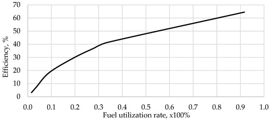 The fuel utilization rate is one of the main factors affecting the dynamic performance and service life of SOFC. The electrical efficiency of the cell is increased by more than 25% by changing fuel consumption from 40% to 90%. Such sharp changes are associated with the strong dependence of efficiency and fuel utilization on the inlet fuel flow rate. It can be seen that increasing fuel use significantly affects the efficiency of fuel cells (Figure 23). However, in practice, fuel cells operating at high fuel utilization rates (>95%) suffer from rapid reductions in current density and efficiency [40]. Therefore, despite the increase in efficiency, the fuel utilization rate should be maintained within an acceptable range from 0.7 to 0.9 to prevent fuel depletion, sudden voltage rise, and associated irreversible damage, as recommended by manufacturers [41].