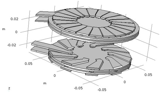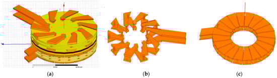 Planar transformers come in a variety of forms, depending on the research requirements. The most common forms are as follows: with modified and partially inclined deformed planar windings or with purely planar windings that take the form of part of a sector, the transformer’s primary and secondary. Generally, planar toroidal coils are constructed from two thin coaxial cylinders arranged in parallel. Each cylinder is segmented into n unconnected sectors, leading to gaps between the turns, as shown in Figure 2 [,].