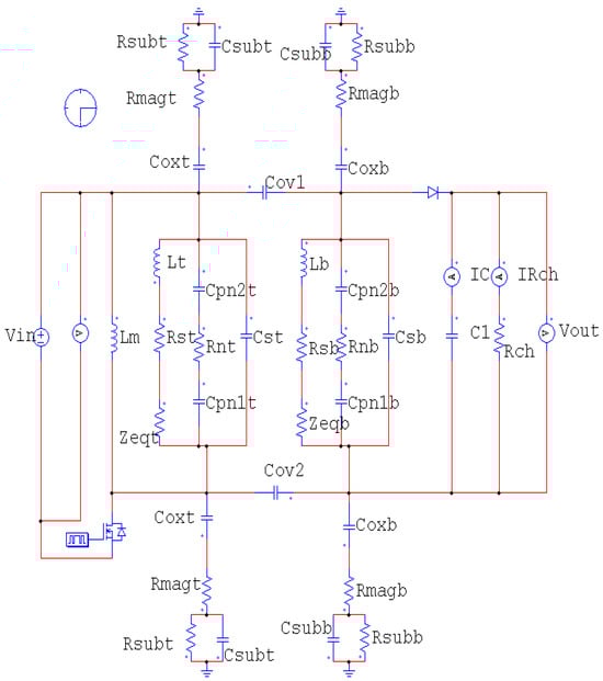Let us now present the analytical expressions for the various elements of the electrical circuit: Rst, Rsb primary and secondary coil substrate resistances; Coxt, Coxb, parasitic capacitance, and oxide capacitors; Cpn2 parasitic capacitance between the part of the core above the last foil at the bottom and the 1st foil at the top (Cpn2 is above Cpn1); Rn2 core resistance; Covt coupling capacitance between turns; and Cst, Csb primary and secondary coil substrate capacitance.