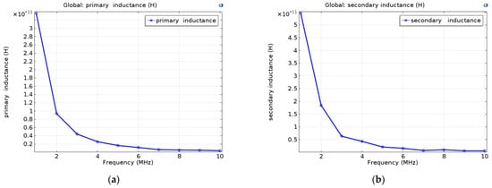 Figure 6 shows the influence of the frequency on the inductances of the primary lt and secondary lb. These inductances are extracted from the imaginary part of the impedances and are expressed by Equation (1).