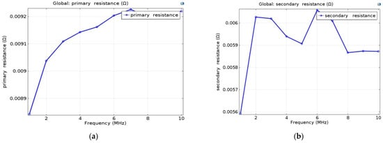 Figure 7 shows the influence of the frequency on the series resistors of primary Rst and secondary Rsb. The obtained results are very satisfactory: in fact, the results show that the resistance values increase as the frequency increases and the inductances decrease. Figure 7 shows that the resistances Rst and Rsb increase as a function of frequency (skin effect) and similarly for the impedance (proximity effect). The resistance values are therefore very sensitive to changes in frequency due to the skin and proximity effects. On the other hand, Figure 6 shows that inductance values also vary significantly as a function of frequency. As the frequency increases, skin and proximity phenomena increase. The current density then becomes increasingly inhomogeneous in the conductor, with a concentration on the surface in the skin thickness.