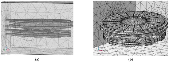 The numerical resolution of the physical problem for the study of the magnetothermal behavior of the transformer was carried out using the finite element method based on Galerkin discretization under the software package COMSOL Multiphysics 6.0. The solution of Equation (12) will allow us to visualize the magnetic behavior of the planar coil [,]. Figure 10 illustrates the mesh grid adapted to the device object of the present analysis.It is a tetrahedral grid refined in the vicinity of the walls of the study area, including the transformer boundaries. In order to ensure the reliability and accuracy of the numerical results, a test of the independence of the results with respect to the type of mesh and the number of elements was carried out. For this purpose, we opted for a number of elements of 1,235,802, beyond which the simulation results remain unchanged.