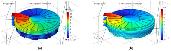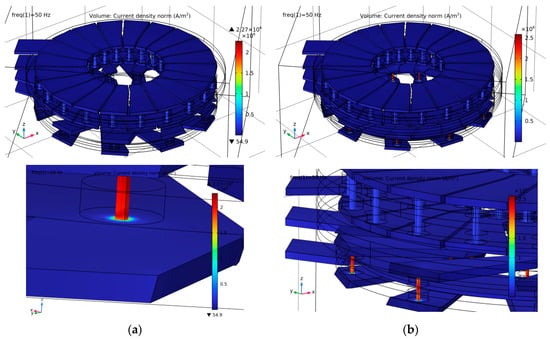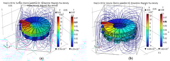 By solving Maxwell’s equations, we can also visualize the electrical current density distribution in the planar toroidal transformer in 3D. Figure 14 shows the current density distribution in the planar transformer. It is minimal inside the transformer because of the conductor resistance. Moreover, it is not uniform in the planar transformer; it is greater at the corners, which induces non-homogeneous resistance in the conductors []. It should be noted that the skin effect and the proximity effect are present and occur, in particular, between adjacent conductors. Figure 15 shows the distribution of the electric current density in the two toroidal coils making up our transformer in the two cases: absence and presence of a magnetic material (a magnetic core). By virtue of the homogeneity of the coil material, the current density in both cases is the same. On the other hand, in both cases, the current density is high at the links connecting the upper and lower turns. This is due to the small cross-section of the links.