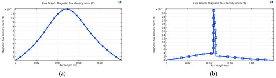 For a more detailed analysis, Figure 13 shows the magnetic flux density distribution along the vertical line running through the middle of the transformer’s two coils. It can also be seen that the magnetic density generated by the transformer is greater when a magnetic core is present. This confines the magnetic field lines, leading to a peak at the magnetic core.