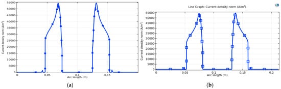 As shown in Figure 16, indeed, across a horizontal line that passes longitudinally through two primary windings facing each other in the two cases studied, the current density curves are almost identical. On the other hand, along the measurement line, the current density increases as the turn shrinks (from the outside diameter to the inside diameter).