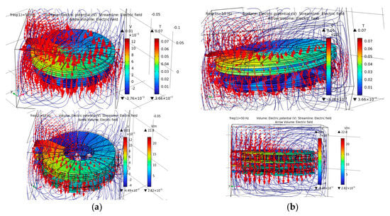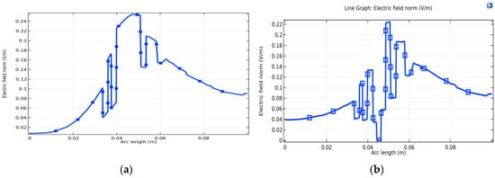 Let us now investigate the electric field. Figure 16 shows the distribution of the electric field lines in the vicinity of the coil in both cases. As is recognized in the literature, the electric field has a divergent pattern perpendicular to the surface of the coils. On the other hand, by comparing the two cases studied, we can see that the electric field intensity is lower in the presence of a magnetic core, as evident in Figure 17.