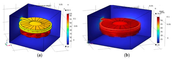 In this section, we present a comparison between the thermal behavior of our devices in the presence and absence of a magnetic core. Figure 18 and Figure 19 illustrate the temperature distribution within the study area. We can see that the highest temperature is at the secondary coil turns in both cases. On the other hand, the greatest amount of heat was generated by the transformer, which does not have a magnetic core. At the turns of the two transformers, the temperature rises as the electric current moves away from the outlets and inlets. On the other hand, the temperature peak is located at the cylindrical links connecting the upper and lower turns. The small diameter of these links results in a high current density, leading to an increase in temperature.