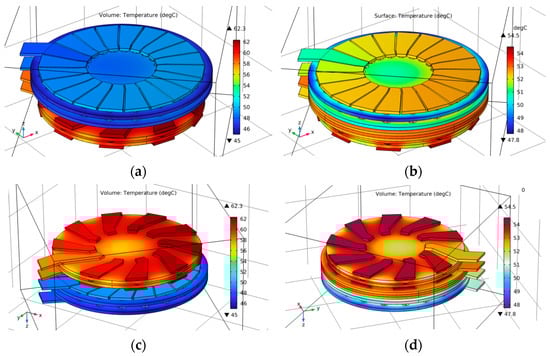 Temperature distribution in the primary coils: Distribution of the electric field in the study area from different perspectives: without NiFe (a); with NiFe (b), and in the secondary coils: without NiFe (c); with NiFe (d).