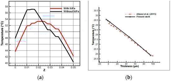 Validation: thermal distribution along the vertical center line with and without magnetic core (a); temperature distribution in the core and comparison with the literature (b).