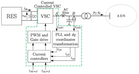 Functional block scheme of the current-controlled VSC and electrical circuit connecting the DER to the ADN.