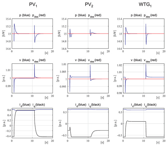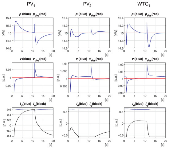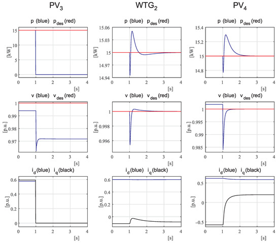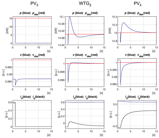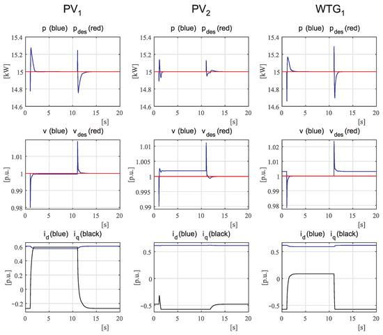 The fifth simulation aims at showing the results obtained when a DER is disconnected. In particular, at a time instant equal to 1 s, the PV is disconnected. Figure 8 reports the time evolution of the active power, nodal voltage and current components for the DERs connected along the second feeder, including PV that is disconnected. From the analysis of the figure, it is evident that the other two DERs promptly react to the perturbation related to the disconnection of PV by restoring both the active power and the voltage at the desired values. The variation in the control variables, that is, the current components, is very smooth. In conclusion, the proposed control proves to be robust also with respect this perturbation.