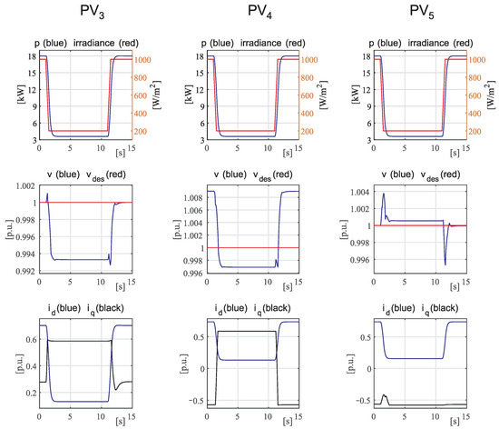 The second simulation analyzes the performance obtained in response to a variation in the solar radiation. Furthermore, the voltage amplitudes will be affected due to the significant impact of active power flows on the voltages in LV distribution feeders. The ADN operates with loads equal to 100% of their rated values and the voltage of the MV busbar equal to 1.025 p.u. Concerning the DERs, PVs are subject to 1000 solar irradiance, and the active power set points are set to 18 kW. The WTGs are subject to 10 m/s wind speed, and the active power set points are equal to 15 kW. All the voltage set points are set equal to 1.0 p.u. Starting from such an operating condition, the effect of passing cloud is simulated: at time instant equal to 1 s, the irradiance suddenly decrease to 200 and at time instant equal to 11 s is suddenly restored to 1000 . Since the impact is mainly on the PVs, the time evolution of the electrical quantities of interests for PV, PV and PV, connected to the second and third feeder, are reported in Figure 5. In particular, the first row reports the plots of the injected active powers together with the solar irradiation, whereas the second row reports the plots of the other regulated variables that are the voltage amplitudes at the PCC, together with the unitary set points; in addition, the control variables and are reported in the last row. The analysis of Figure 5 confirms the same conclusions drawn for the previous first simulation, concerning the smooth yet fast responses to the perturbations that are guaranteed for both regulated and control variables. Due to the large variations in the injected active powers, the consequent voltage variations are large too and the current component is often saturated to its bounds. The consequence is the non-zero steady-state error on the voltage amplitude, but since the error is kept small, the contribution of DER to keeping the voltage amplitude near to the unitary value is quite evident anyway.