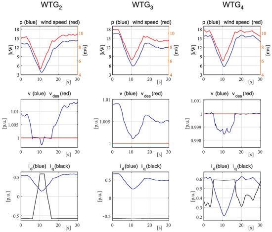 Case 3: Time evolution of the main quantities of the WTGs of the second and third feeder in response to a variation in the wind speed.