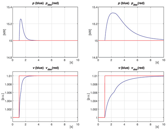 The first comparison is performed in terms of response to a step variation of the voltage set point. In details, of is changed from 1.0 to 1.01 p.u. at a time instant equal to 1.0 s. Figure 9 reports the time evolution of the active power and voltage for for both the proposed controllers and the controllers in [38]. It is apparent that a better response is obtained by the proposed controllers, which is confirmed by the resulting values of and reported in Table 2.