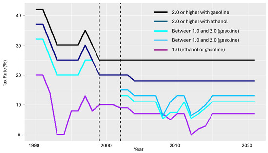 Price and tax regimes are powerful tools used to induce changes in market shares in Brazil [38]. The average tax burden of the total vehicle price is 30.4% in the country compared to approximately 17% in some large European markets, 11.5% in Japan, and 6.8% in California, USA [39]. The tax regime in Brazil is particularly complicated. There is a tax on industrialized products (IPIs), based on displacement, the main focus of this discussion. There is also an import tax on financial operations (IOFs), a tax for the Program of Social Integration (PIS), and the Contribution for the Financing of Social Security (COFINS). Lastly, there is a tax on the circulation of goods and the provision of transportation and communication services (ICMSs). Vehicle owners also pay the annual Property Tax on Motor Vehicles (IPVA). Figure 3 illustrates the progression of IPI tax rates in Brazil. In this figure, each color represents a category. From top to bottom, the black and dark blue lines represent gasoline and ethanol engines above 2.0 L, respectively. Shades of light blue represent gasoline (13%) and ethanol (11%) engines above 1.0 L but below 2.0. Dashed vertical lines represent the transitional period. Before 1999, engines above 1000 cc were taxed based on horsepower. After 2002, they were taxed based on displacement, with the creation of a bracket for engines above 2.0 L. The purple line is for 1.0 L engines.