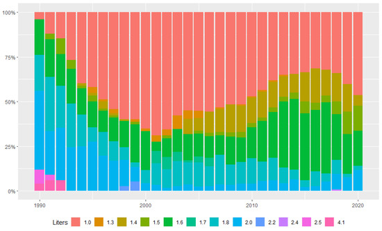 Engine displacement (liters) market share between 1990 and 2020.