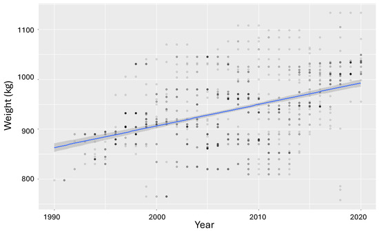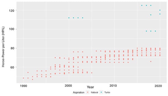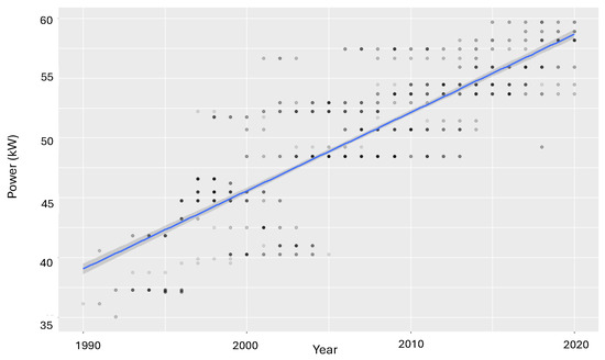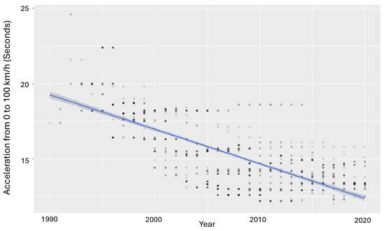 We used a series of regression models to estimate the effects of vehicle attributes on the acceleration performance, such as horsepower, torque, displacement, and weight. To this end, the approach used in [20,21] was employed, with Equations (1) and (2) representing a generalized form. The study period was 1990–2020. Year-fixed effects, , capture the technical evolution compared to a base year, according to Equation (2). This multiplicative model can be used to determine technological progress. The term is the vehicles’ weight, and is the slope of the curve and represents the rate with which the parameters’ weights and performance influence the acceleration. Finally, the parameter relates to air intake technology, B represents other variables with less influence, is an average zero-error term, and is the performance.