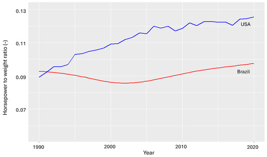 We can calculate acceleration in its most simplified form using only two parameters: peak power and weight (power-to-weight ratio). According to Malliaris et al. [41], this relationship is “overwhelmingly influential” with regard to acceleration performance. Figure 11 illustrates this ratio for the Brazilian (red line) and USA (blue line) light-duty vehicle (LDV) fleets between 1990 and 2020. It is important to highlight that the acceleration rate decreased for more than a decade; this trend was reversed only in 2002 and continues its upward trajectory to this day. The power-to-weight ratio reached the 1990 target levels around 2012.