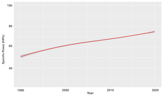 Trend in specific HP between 1990 and 2020. Evolution of horsepower and torque-to-displacement ratio in the Brazilian LDV fleet between 1990 and 2020 [49].