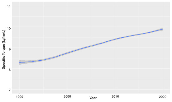 Trend in specific torque between 1990 and 2020. Evolution of torque-to-displacement ratio in the Brazilian LDV fleet [49].