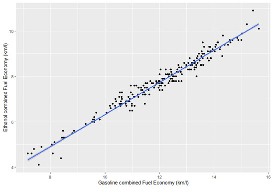 FFV ethanol and gasoline fuel efficiency correlation for MY2020 models. Blue line represents linear tendency for illustration purposes only. Data obtained from [66].
