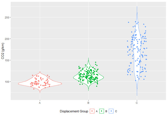 CO2 emission rates for each displacement group. A refers to 1.0 L engines, B to above 1.0 L and below 2.0 L, and C to more than 2.0 L. EVs and HEVs are excluded. Values are for 2021 from [66].