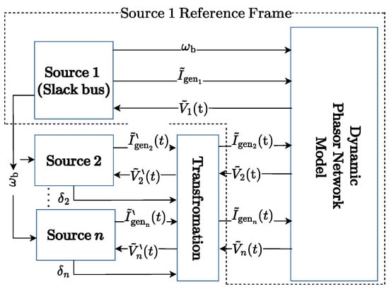 The term in (6) denotes the momentary frequency of the natural quantities that are transformed to dynamic phasors. Since there are multiple frequency generation sources in the system, a constant nominal value cannot be used in the development of various component models. As such, the dynamic phasor quantities of the network (i.e., the line, bus, and static load models) are represented using the frequency of one of the sources (typically the generator at the slack bus in the power flow solution) with a rotational speed of , which is taken as the frequency of the common reference frame. Other sources are modeled in their own reference frames rotating at their respective speeds. Dynamic phasors of voltages and currents from other reference frames are transformed back and forth between the common reference frame and their own respective reference frames [1,23].
